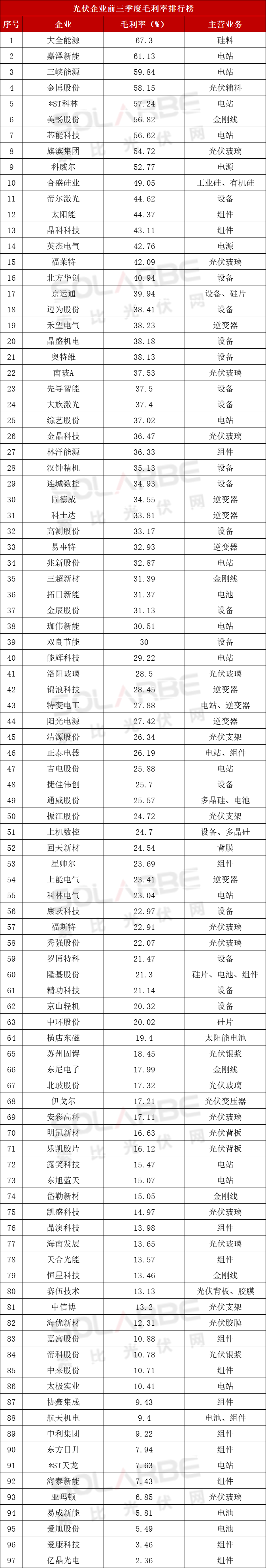 而前三季度毛利率在50%以上的光伏企業(yè)有9個,多為光伏原材料、輔材以及電站運營企業(yè),它們是大全能源67.3%、嘉澤新能61.13%、三峽能源59.84%、金博股份58.15%、*ST科林57.24%、美暢股份56.82%、芯能科技56.62%、旗濱集團54.72%、科威爾52.77%。