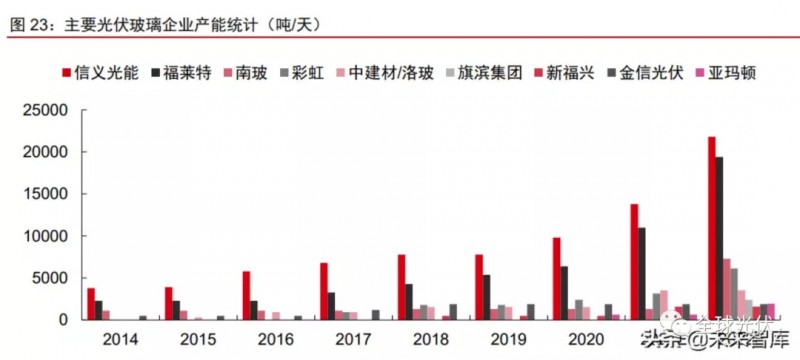 2021/2022年光伏玻璃開啟集中擴產(chǎn)潮,行業(yè)產(chǎn)能增量明顯。根據(jù)主要光伏玻璃廠商建設(shè)規(guī)劃,我們測算2021/2022年光伏玻璃行業(yè)新增日熔量或分別達1.9和2.5萬噸/天,產(chǎn)能進入集中投放期。其中,2022年除了信義光能和福萊特兩家頭部廠商有近1.5萬噸/天新產(chǎn)能陸續(xù)投放外,還包括南玻、彩虹、淇濱等二線企業(yè)和新進入者大舉擴產(chǎn)??紤]到新產(chǎn)線從點火到穩(wěn)定出貨一般需經(jīng)歷3-4個月爬坡期,尤其是新進入者爬坡期可能更長,實際產(chǎn)出增量將打折扣,預(yù)計2021/22年行業(yè)有效日熔量增量約為1.4/2萬噸,整體增幅仍然較大。