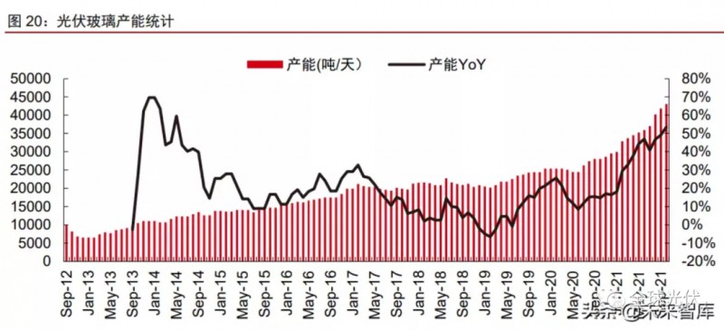光伏玻璃產(chǎn)能迎來加速投放。由于光伏玻璃產(chǎn)能置換政策限制放寬,以及“雙碳”目標(biāo)下光伏行業(yè)長期增長潛力進一步增強,2021年以來光伏玻璃行業(yè)進入產(chǎn)能加速投放階段。截至2021年10月,國內(nèi)光伏玻璃日熔化量約4.31萬噸/天(+53.5%YoY)。