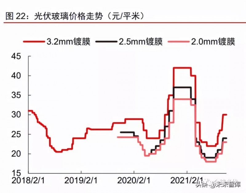 2021年光伏玻璃價格大幅回落,2022年價格或?qū)⒕S持中低位波動。光伏玻璃供需格局的變化也反應(yīng)在企業(yè)庫存。據(jù)卓創(chuàng)資訊統(tǒng)計,2021H1,隨著行業(yè)產(chǎn)能擴張以及需求延后,光伏玻璃行業(yè)主流廠商庫存天數(shù)由年初10天以內(nèi)快速增至40天左右;受此影響,光伏玻璃價格也于4月從高點出現(xiàn)“腰斬式”下跌。隨著Q3后庫存逐步消化回落,以及受純堿價格大幅上漲推動,光伏玻璃價格從底部開始有所回升,目前3.2mm產(chǎn)品價格約30元/平米,2.0mm產(chǎn)品價格約23元/平米。展望2022年,我們認(rèn)為在原材料成本有望逐步回落,且行業(yè)供需格局總體保持寬松的情況下,光伏玻璃價格有望在中低水平整體保持穩(wěn)定,預(yù)計3.2mm和2.0mm玻璃價格或?qū)⒃?5元/平米和20元/平米的中樞附件波動。