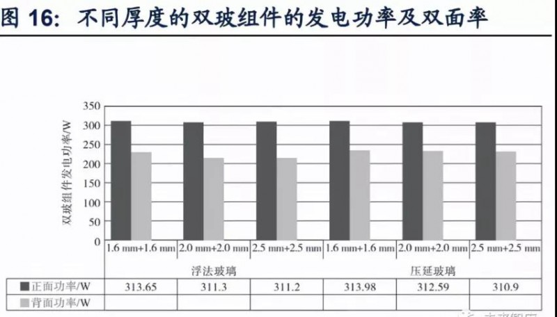 超白浮法玻璃力學(xué)性能更優(yōu),薄化后作為背板的發(fā)電功率接近超白壓延玻璃,陸續(xù)出現(xiàn)組件廠商采用超白浮法玻璃作為背板以降低成本。浮法玻璃表面平整度高,抗沖擊強(qiáng)度較壓延玻璃更為出色,并且隨著厚度降低,二者抗沖擊強(qiáng)度相差拉大,在1.6 mm浮法玻璃平均破碎高度高出超白壓延玻璃達(dá)97.77%。另外,雖然浮法玻璃透過(guò)率不如超白壓延玻璃,作為雙玻組件背板后會(huì)導(dǎo)致背面發(fā)電功率降低,但隨著厚度減小,二者發(fā)電功率差距逐漸降低,1.6mm雙玻組件下的背面發(fā)電功率相差僅為5.45W。浮法玻璃作為組件背板使用時(shí),雙玻組件正面發(fā)電功率也可達(dá)到壓延玻璃作為背板時(shí)的發(fā)電功率。因此陸續(xù)有組件公司為降低生產(chǎn)成本,使用浮法玻璃作為背板。