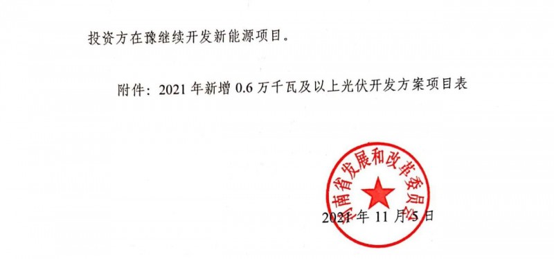 11月5日,河南省發(fā)改委下發(fā)《關(guān)于下達(dá) 2021年新增0.6萬千瓦及以上光伏項(xiàng)目開發(fā)方案的通知》。文件指出,對于不新增用地、利用固定建筑物及其附屬場所建設(shè)的光伏項(xiàng)目,不限申報(bào)規(guī)模!