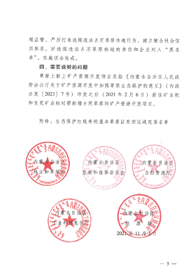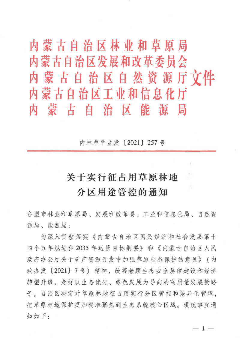 近日,內(nèi)蒙古自治區(qū)林業(yè)和草原局,內(nèi)蒙古自治區(qū)發(fā)展和改革委員會(huì),內(nèi)蒙古自治區(qū)自然資源廳,內(nèi)蒙古自治區(qū)工業(yè)和信息化廳,內(nèi)蒙古自治區(qū)能源局聯(lián)合發(fā)布了《關(guān)于實(shí)行征占用草原林地分區(qū)用途管控的通知》,把草原林地保護(hù)更加精準(zhǔn)聚焦到生態(tài)系統(tǒng)核心區(qū)域。文件顯示,內(nèi)蒙古將實(shí)行征占用草原林地分區(qū)用途管控。