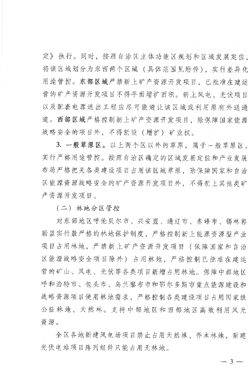 對(duì)東部地區(qū)呼倫貝爾市、興安盟、通遼市、赤峰市、錫林郭勒盟實(shí)行最嚴(yán)格的林地保護(hù)制度,嚴(yán)格控制新上能源資源型產(chǎn)業(yè)項(xiàng)目占用林地,嚴(yán)禁新上礦產(chǎn)資源開發(fā)項(xiàng)目(保障國家和自治區(qū)能源戰(zhàn)略安全項(xiàng)目除外)占用林地,嚴(yán)格控制已批準(zhǔn)在建運(yùn)營(yíng)的礦山、風(fēng)電、光伏等各類項(xiàng)目新增占用林地。