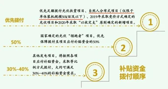 二、電網(wǎng)企業(yè)應(yīng)嚴(yán)格按照《資金管理辦法》,將補(bǔ)貼資金撥付至已納入可再生能源發(fā)電補(bǔ)助項(xiàng)目清單范圍的發(fā)電項(xiàng)目。在撥付補(bǔ)貼資金時(shí),應(yīng)優(yōu)先足額撥付國家光伏扶貧項(xiàng)目、50kW及以下裝機(jī)規(guī)模的自然人分布式項(xiàng)目至2022年底;優(yōu)先足額撥付公共可再生能源獨(dú)立系統(tǒng)項(xiàng)目至2021年底;優(yōu)先足額撥付2019年采取競(jìng)價(jià)方式確定的光伏項(xiàng)目、2020年起采取“以收定支”原則確定的符合撥款條件的新增項(xiàng)目至2021年底;對(duì)于國家確定的光伏“領(lǐng)跑者”項(xiàng)目和地方參照中央政策建設(shè)的村級(jí)光伏扶貧電站,優(yōu)先保障撥付項(xiàng)目至2021年底應(yīng)付補(bǔ)貼資金的50%;對(duì)于其他發(fā)電項(xiàng)目,按照各項(xiàng)目至2021年底應(yīng)付補(bǔ)貼資金,采取等比例方式撥付。