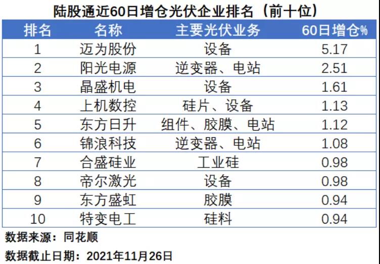 在陸股通近60日增倉排名中,邁為股份、陽光電源和晶盛機電分居前三位,增倉幅度分別為5.17%、2.51%和1.61%,其中邁為股份和晶盛機電均為光伏設(shè)備企業(yè),前者的核心產(chǎn)品為太陽能電池絲網(wǎng)印刷生產(chǎn)設(shè)備,后者主營產(chǎn)品為晶體生長設(shè)備。上機數(shù)控、東方日升、錦浪科技、合盛硅業(yè)、帝爾激光、東方盛虹和特變電工分居第四到第十位。前十名中,涉足光伏設(shè)備業(yè)務(wù)的企業(yè)高達(dá)4家,涉足電站業(yè)務(wù)的企業(yè)為3家。