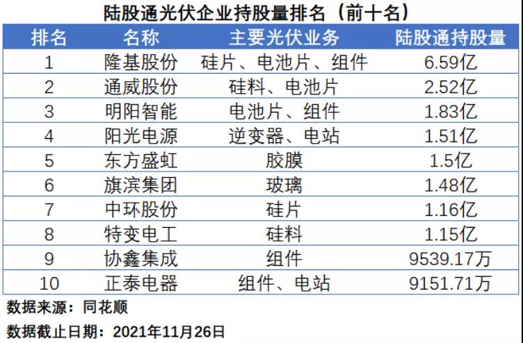 在陸股通持股量排名中,截止到11月26日收盤(下同),隆基股份憑借自身超強的綜合實力以及較高的總股本規(guī)模最受“北向資金”的青睞,以6.59億的持股量位居第一,通威股份和明陽智能分別以2.52億和1.83億位居第二和第三。陽光電源、東方盛虹、旗濱集團、中環(huán)股份、特變電工的持股量均在1億股以上。在前十名中,共有4家企業(yè)涉足組件業(yè)務(wù),3家企業(yè)涉足電池片業(yè)務(wù),涉足硅料、硅片業(yè)務(wù)的企業(yè)各有2家。