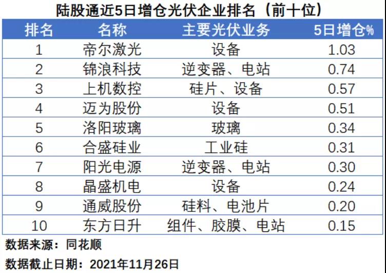 在陸股通近5日增倉排名中,電池片生產(chǎn)設(shè)備廠商帝爾激光最受“北向資金”追捧,以1.03%的增持幅度排名第一,錦浪科技、上機數(shù)控以0.74%和0.57%位居第二和第三,邁為股份、洛陽玻璃、合盛硅業(yè)、陽光電源、晶盛機電、通威股份和東方日升位居第四到第十位。前十名中,涉足光伏設(shè)備領(lǐng)域的企業(yè)數(shù)量依然為最多,達(dá)到了4家。
