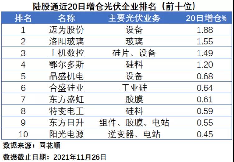 在陸股通近20日增倉排名中,邁為股份、洛陽玻璃和上機數(shù)控位居前三位,增持幅度分別為1.88%、1.55%和1.45%,值得一提的是,洛陽玻璃于11月26日正式發(fā)布了產(chǎn)能擴建計劃,未來公司在光伏玻璃領(lǐng)域的市場地位將進(jìn)一步得到鞏固;上機數(shù)控此前三季報業(yè)績不及預(yù)期,股價大跌,而“北向資金”則選擇了逆勢抄底。排名第四到第十位的企業(yè)分別為鄂爾多斯、晶盛機電、合盛硅業(yè)、東方盛虹、特變電工、東方日升和陽光電源。