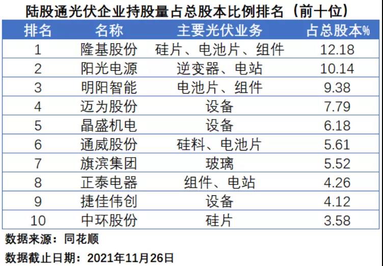 在陸股通持股量占總股本比例排名中,隆基股份以12.18%排名第一,陽光電源和明陽智能分別以10.14%和9.38%分居第二和第三位,邁為股份、晶盛機電、通威股份、旗濱集團、正泰電器、捷佳偉創(chuàng)和中環(huán)股份位居第四到第十位。值得注意的是,前十名中,光伏設(shè)備企業(yè)的數(shù)量達(dá)到3家,占比最高。在如今光伏行業(yè)產(chǎn)能規(guī)模持續(xù)提升、個別環(huán)節(jié)的技術(shù)路線仍存一定變數(shù)的情況下,景氣度較高的光伏設(shè)備領(lǐng)域頗受“北向資金”青睞。