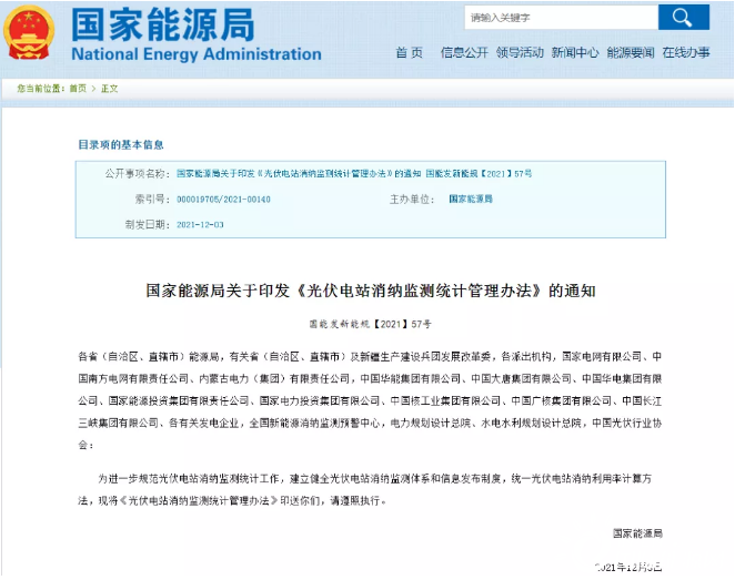 12月20日,國家能源局發(fā)布關(guān)于印發(fā)《光伏電站消納監(jiān)測(cè)統(tǒng)計(jì)管理辦法》的通知。