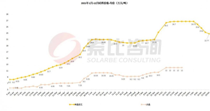 索比咨詢預計,2022年硅料價格保持高位運行。受新產(chǎn)能投放節(jié)奏影響,預計Q2前硅料價格保持高位,年初價格在200元/KG,年底將達100元/KG。