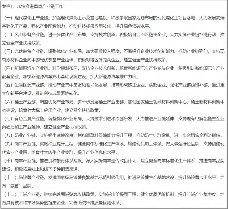 2月9日,內(nèi)蒙古自治區(qū)人民政府發(fā)布了《關(guān)于下達(dá)2022年內(nèi)蒙古自治區(qū)國民經(jīng)濟和社會發(fā)展計劃的通知》。通知提出,加快推進(jìn)光伏裝備產(chǎn)業(yè)鏈等重點產(chǎn)業(yè)鏈工作,包括調(diào)整優(yōu)化產(chǎn)業(yè)布局,加大研發(fā)投入強度,不斷提升企業(yè)技術(shù)創(chuàng)新能力;推動產(chǎn)業(yè)鏈延伸,支持現(xiàn)有原材料企業(yè)向中游光伏裝備產(chǎn)業(yè)延伸,積極對接區(qū)外龍頭企業(yè),建立健全產(chǎn)業(yè)扶持政策。