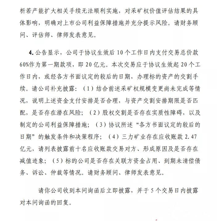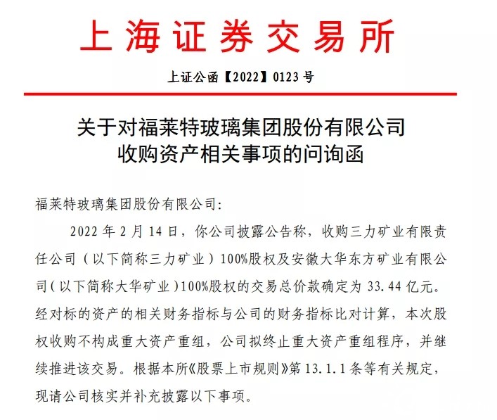 上交所近期發(fā)布問詢函,就光伏玻璃巨頭福萊特對三力礦業(yè)、安徽大華東方礦業(yè)等100%股權(quán)的收購案進行問詢,兩項收購額總計為33.44億。