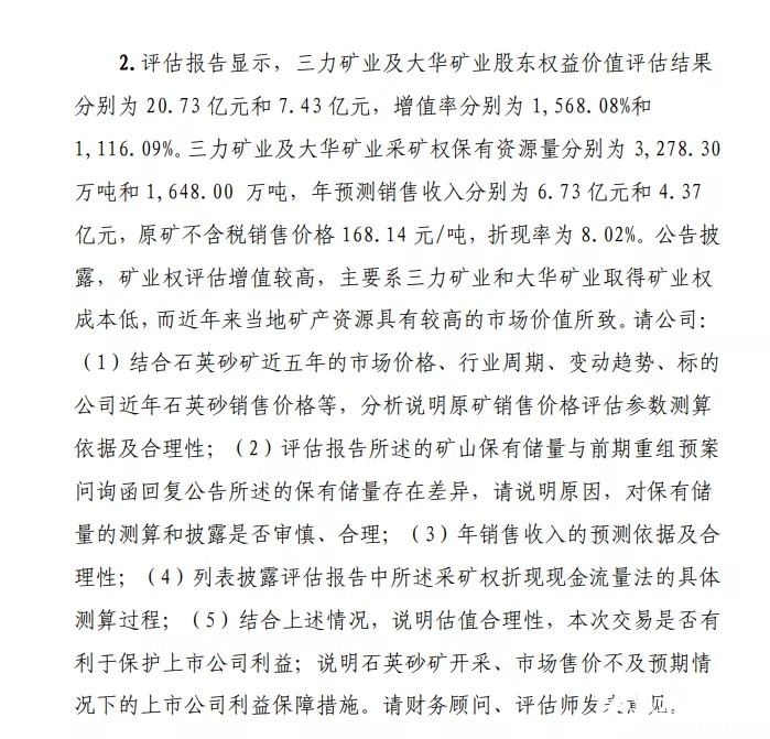 同時,上交所也指出,上述兩家(擬被收購)公司的股東權(quán)益價值評估結(jié)果分別為20.73億和7.43億,增值率為1568%和1116%,兩家公司的年預(yù)測銷售收入為6.73億和4.37億,請福萊特對石英砂礦的近五年市場價、行業(yè)周期、變動趨勢和標的公司近年來石英砂銷售價等,分析說明原礦銷售價評估參數(shù)測算依據(jù)及合理性。同時也說明年銷售收入的預(yù)測依據(jù)、估值的合理性等。
