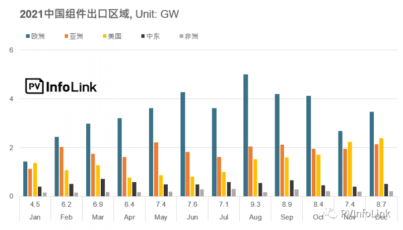 亞洲市場是從23.3GW微幅下降到22.4GW,2021全年占比下降為25%,但仍是中國組件出口的第二大市場,GW級進口國包括印度、日本、澳大利亞和泰國,韓國與馬來西亞也有接近1GW的進口量。2020年亞洲從中國進口最多組件的越南則是在補貼政策結(jié)束后進口量快速減少,從原本的最大進口國下降到僅有0.4GW的進口量。