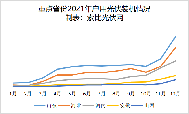 從2021年各省戶用光伏裝機(jī)規(guī)模看,山東、河北、河南依然是最核心的三個主力市場,安徽、山西、江西、福建、江蘇等5個省也實(shí)現(xiàn)了裝機(jī)超400MW、占比超2%的目標(biāo)。