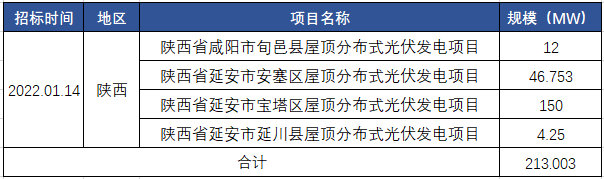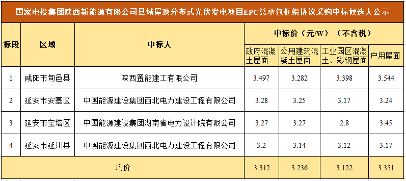 3月2日,國家電投集團(tuán)陜西新能源有限公司縣域屋頂分布式光伏發(fā)電項目EPC總承包框架協(xié)議采購中標(biāo)候選人公示。項目合計規(guī)模為213MW,陜西置能建工有限公司中標(biāo)咸陽市旬邑縣12MW屋頂分布式項目,中能建三個子公司中標(biāo)剩余201MW項目。所有項目均價為3.26元/W。