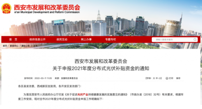 3月11日,陜西省西安市發(fā)改委發(fā)布關(guān)于申報2021年度分布式光伏補(bǔ)貼資金的通知。