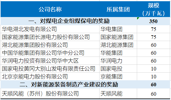 1)對煤電企業(yè)組煤保電的獎勵,350萬千瓦;