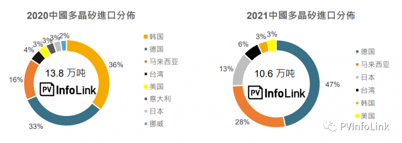 2021年進(jìn)口多晶硅主要來自德國(guó)和馬來西亞,兩者占比達(dá)到了75%,主因兩國(guó)擁有瓦克和OCI兩家目前生產(chǎn)較為穩(wěn)定的非中國(guó)廠家。與2020年比較,出口多晶硅到中國(guó)的國(guó)家數(shù)量減少,且過去占據(jù)進(jìn)口量第一名的韓國(guó)占比快速縮小,在韓國(guó)國(guó)內(nèi)生產(chǎn)設(shè)施目前沒有重啟的意愿下,預(yù)期未來占比將趨近于0%。其他來自日本或是臺(tái)灣的多晶硅進(jìn)口,因該地區(qū)沒有多晶硅生產(chǎn)設(shè)施,可能是過去所簽訂的多晶硅長(zhǎng)單未完全使用而轉(zhuǎn)售,但也僅有小量的占比。