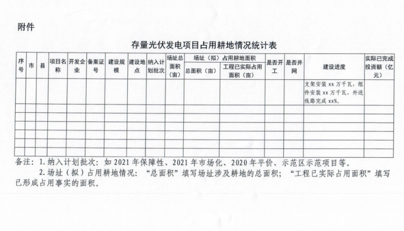 3月11日,河北省能源局啟動(dòng)存量光伏電站占用耕地摸底統(tǒng)計(jì)工作,文件要求對(duì)照自然資源部門土地年度變更調(diào)查數(shù)據(jù)庫(kù),對(duì)已列入省年度計(jì)劃、尚未辦理建設(shè)用地審批手續(xù)的存量光伏發(fā)電項(xiàng)目占用耕地情況進(jìn)行摸底統(tǒng)計(jì)。附表信息統(tǒng)計(jì)中包括項(xiàng)目名稱、開發(fā)企業(yè)、備案證號(hào)、建設(shè)規(guī)模及地點(diǎn)、納入計(jì)劃批次以及場(chǎng)址總面積、已占用面積以及建設(shè)進(jìn)度等多項(xiàng)詳細(xì)信息。