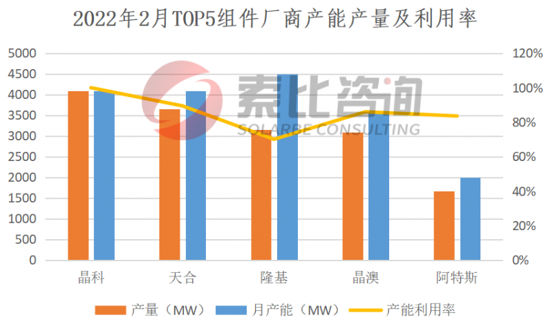 2022年2月,海內外市場組件需求旺盛,國內組件產量25.5GW,環(huán)比大增22.63%。一方面,國內部分地面電站項目補裝、央國企組件開標規(guī)模近40GW,一方面,印度即將實施新的關稅政策引發(fā)搶裝。按照產量排名,晶科、天合、隆基、晶澳、阿特斯位列前五,企業(yè)總產量15.63GW,占比61.29%,綜合開工率85.75%。預計2022年3月,組件需求和排產基本維持2月水平,國內電站補裝及印度搶裝效應逐步淡化。