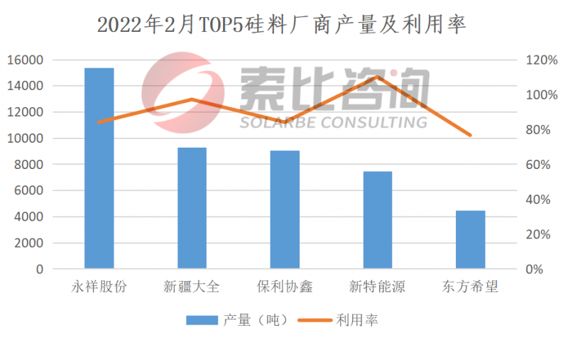 2022年2月,國內13家多晶硅企業(yè)在產,大全、永祥、協(xié)鑫、新特擴產增量釋放,產量小幅增加。2月份國內多晶硅產量為5.23萬噸(約20.66GW),環(huán)比增長0.58%。按照產量排名,永祥、大全、協(xié)鑫、新特、東方希望位列前五,企業(yè)總產量4.57萬噸,占比87.4%,綜合利用率90.3%。索比咨詢預期3月份硅料產量繼續(xù)小幅上漲。從供應端來看,國內外終端需求上升,硅片企業(yè)開工率持續(xù)提升,硅料擴產釋放亦有增量,預計3月份協(xié)鑫、永祥、新特等企業(yè)擴產產能仍有釋放增量。從需求端來看,供應量增長,價格有望松動,進一步刺激下游需求。