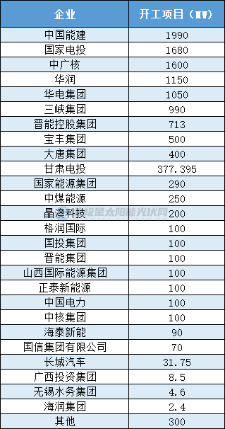 從項目建設(shè)單位來看,除了五大四小發(fā)電集團(tuán)外,地方國企、事業(yè)單位、民營光伏開發(fā)商均在積極開發(fā)建設(shè)光伏項目。其中,中國能建、國家電投、中廣核、華潤、華電開工項目規(guī)模均超1GW以上;三峽集團(tuán)、晉能控股、寶豐集團(tuán)開工項目規(guī)模均在500MW及以上。