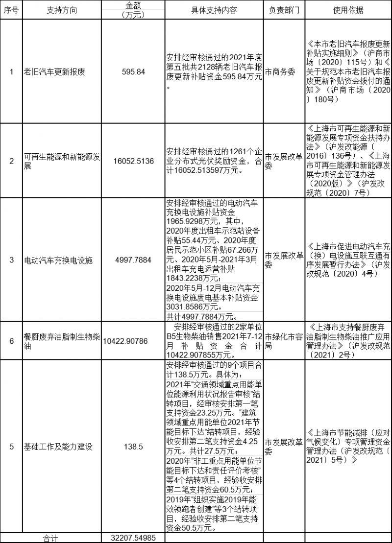 (四)按照《上海市支持餐廚廢棄油脂制生物柴油推廣應(yīng)用管理辦法》(滬發(fā)改規(guī)范〔2021〕2號(hào))規(guī)定,安排經(jīng)審核通過的2家單位B5生物柴油銷售2021年7-12月補(bǔ)貼資金合計(jì)10422.907855萬元。