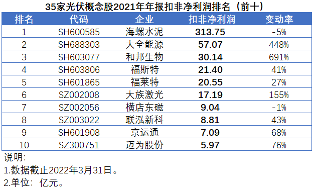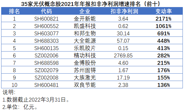 從業(yè)績(jī)?cè)鏊賮砜?,發(fā)電企業(yè)金開新能受益于光伏等新能源場(chǎng)站核準(zhǔn)裝機(jī)量同比增長(zhǎng)129%以及2020年扣非凈利潤(rùn)基數(shù)較低,業(yè)績(jī)暴漲2171%。二氧化硅生產(chǎn)商凱盛科技業(yè)績(jī)暴漲1061%。和邦生物、大全能源以及涉足光伏電池背板領(lǐng)域的樂凱膠片業(yè)績(jī)漲幅分別達(dá)到691%、448%和413%。其它企業(yè)中,精功科技、金博股份、蘇州固锝、大族激光、雙良節(jié)能業(yè)績(jī)漲幅在100%-300%之間。