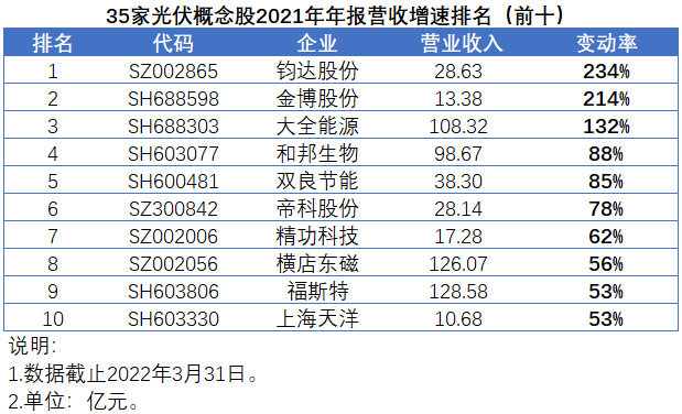 在光伏行業(yè)火熱的市場(chǎng)氛圍中,2022年已經(jīng)悄然走過了四分之一。在過去的三個(gè)月中,A股市場(chǎng)共有35家光伏概念股發(fā)布了2021年年報(bào),營(yíng)收增速均值和中值分別為44%和37%,扣非凈利潤(rùn)增速均值高達(dá)147%,不過中值僅為27%。