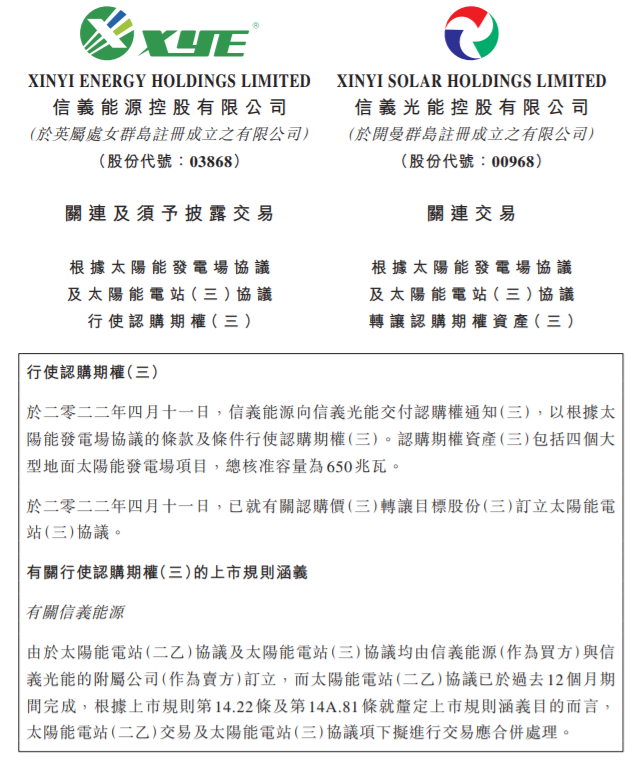 4月11日,信義能源及信義光能聯(lián)合公布公告稱,于2022年4月11日信義能源向信義光能交付認購權(quán)通知(三),以根據(jù)太陽能發(fā)電場協(xié)議的條款及條件行使認購期權(quán)(三)。認購期權(quán)資產(chǎn)(三)包括四個大型地面太陽能發(fā)電場項目,總核準容量為650兆瓦。