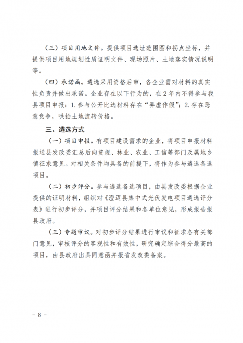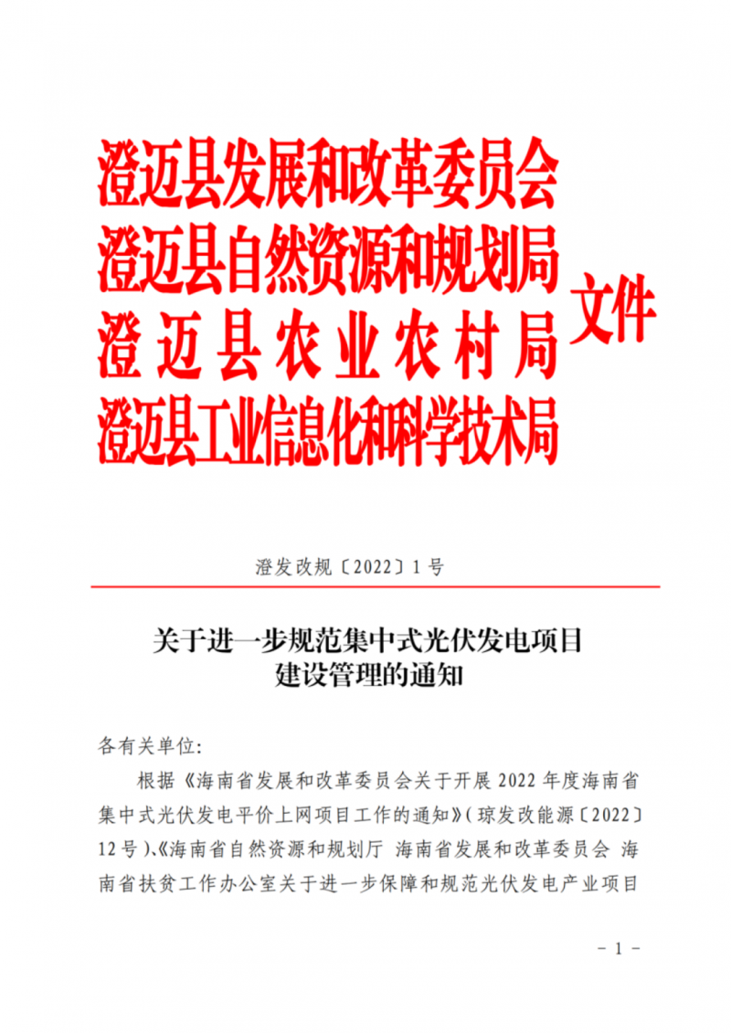 4月11日,澄邁縣發(fā)展和改革委員會、澄邁縣自然資源和規(guī)劃局、澄邁縣農業(yè)農村局、澄邁縣工業(yè)信息化和科學技術局聯(lián)合發(fā)布了《關于進一步規(guī)范集中式光伏發(fā)電項目建設管理的通知》。本通知自2022年5月12日起施行,有效期2年。