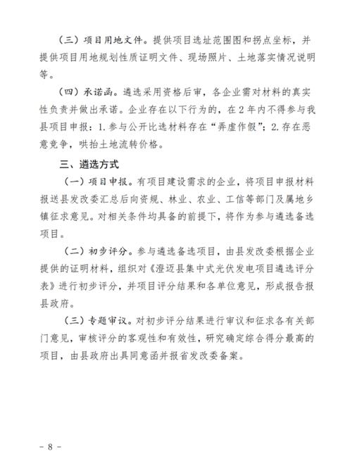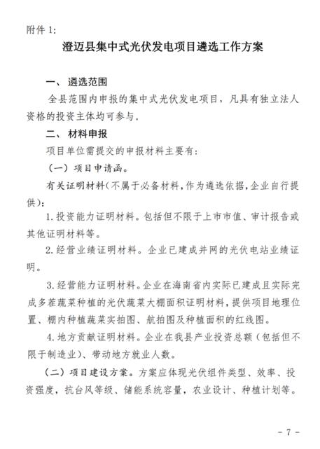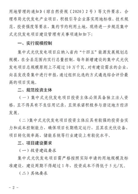 文件規(guī)定了澄邁縣集中式光伏發(fā)電項(xiàng)目應(yīng)納入省內(nèi)“十四五”能源發(fā)展規(guī)劃總規(guī)模,在全縣范圍內(nèi)實(shí)行總量控制,每年新增建設(shè)的集中式光伏發(fā)電項(xiàng)目總規(guī)模原則上不超過10萬千瓦。對有建設(shè)需求的企業(yè),向縣發(fā)改委集中進(jìn)行申報(bào),通過組織比選的方式遴選綜合評價(jià)最高的項(xiàng)目實(shí)施。
