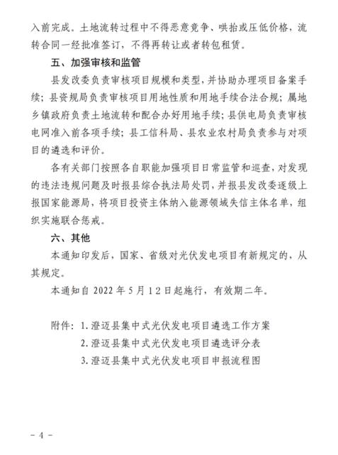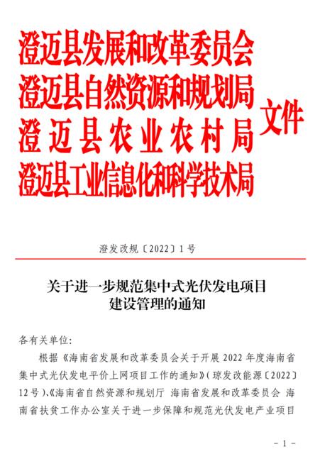 4月11日,澄邁縣發(fā)展和改革委員會、澄邁縣自然資源和規(guī)劃局、澄邁縣農(nóng)業(yè)農(nóng)村局、澄邁縣工業(yè)信息化和科學(xué)技術(shù)局聯(lián)合發(fā)布了《關(guān)于進(jìn)一步規(guī)范集中式光伏發(fā)電項(xiàng)目建設(shè)管理的通知》。本通知自2022年5月12日起施行,有效期2年。