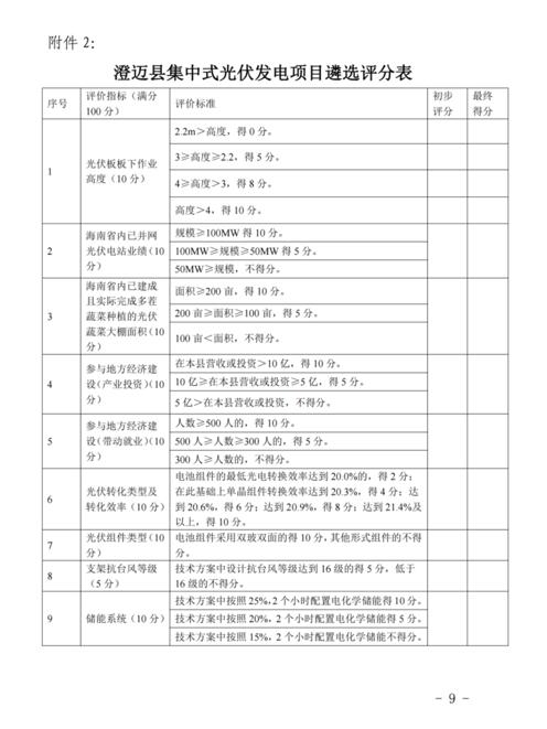 此外,根據(jù)澄邁縣集中式光伏發(fā)電項(xiàng)目遴選評分表,在澄邁縣營收或投資>10億,得10分;10億≥在本縣營收或投資≥5億,得5分;5億>在本縣營收或投資,不得分。配套儲能系統(tǒng)包括,技術(shù)方案中按照25%,2個(gè)小時(shí)配置電化學(xué)儲能得10分。按照20%,2個(gè)小時(shí)配置電化學(xué)儲能得5分。按照15%,2個(gè)小時(shí)配置電化學(xué)儲能不得分。