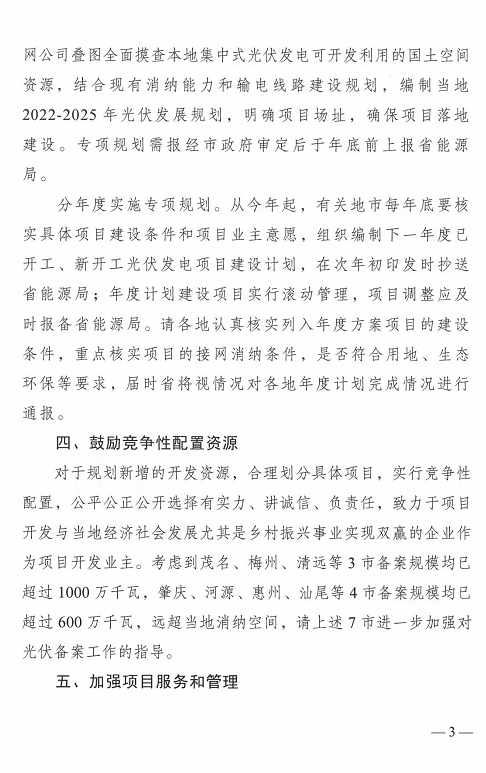 4.鼓勵競爭性配置資源:考慮到茂名、梅州、清遠等3市備案規(guī)模均已超過1000萬千瓦,肇慶、河源、惠州、汕尾等4市備案規(guī)模均已超過600萬千瓦,遠超當(dāng)?shù)叵{空間,請上述7市進一步加強對光伏備案工作的指導(dǎo)。