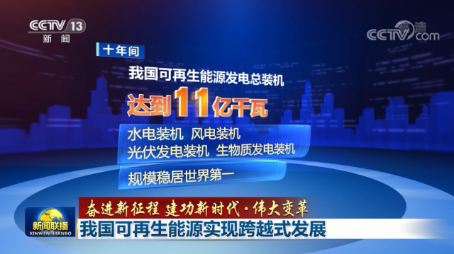 十年間,我國可再生能源發(fā)電總裝機達到11億千瓦,水電、風電、光伏發(fā)電、生物質(zhì)發(fā)電裝機規(guī)模穩(wěn)居世界第一。其中,風電光伏并網(wǎng)裝機合計6.7億千瓦,是2012年的近90倍。
