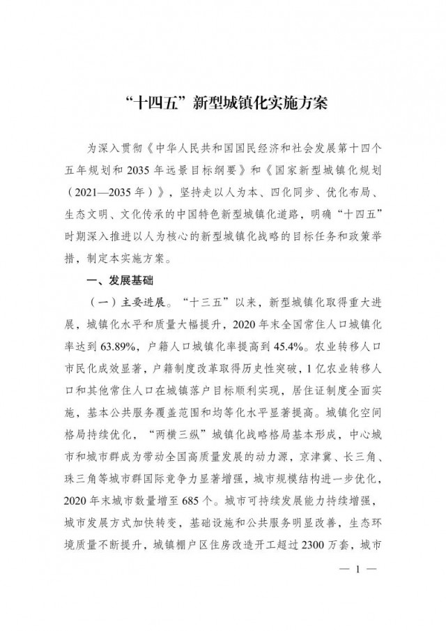 國家發(fā)展改革委關(guān)于印發(fā)“十四五”新型城鎮(zhèn)化實(shí)施方案的通知