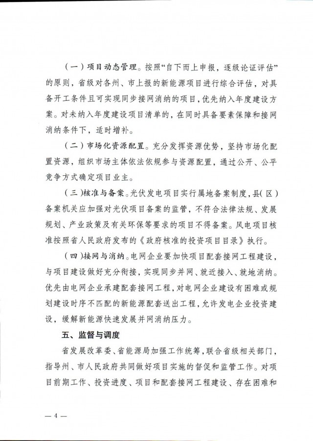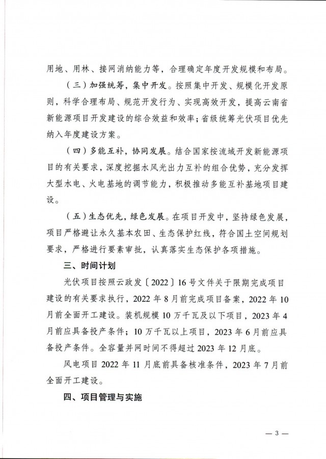 在時間計劃上,光伏項(xiàng)目按照2022年8月前完成項(xiàng)目備案,2022年10月前全面開工建設(shè)。裝機(jī)規(guī)模10萬千瓦及以下項(xiàng)目,2023年4月前應(yīng)具備投產(chǎn)條件;10萬千瓦以上項(xiàng)目,2023年6月前應(yīng)具備投產(chǎn)條件。全容量并網(wǎng)時間不得超過2023年12月底。風(fēng)電項(xiàng)目2022年11月底前具備核準(zhǔn)條件,2023年7月前全面開工建設(shè)。