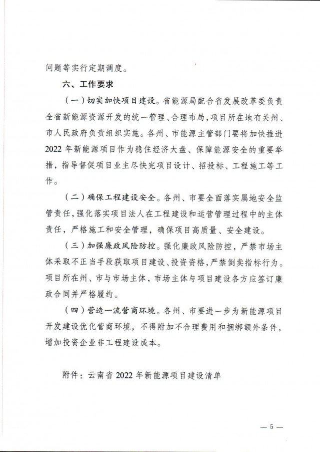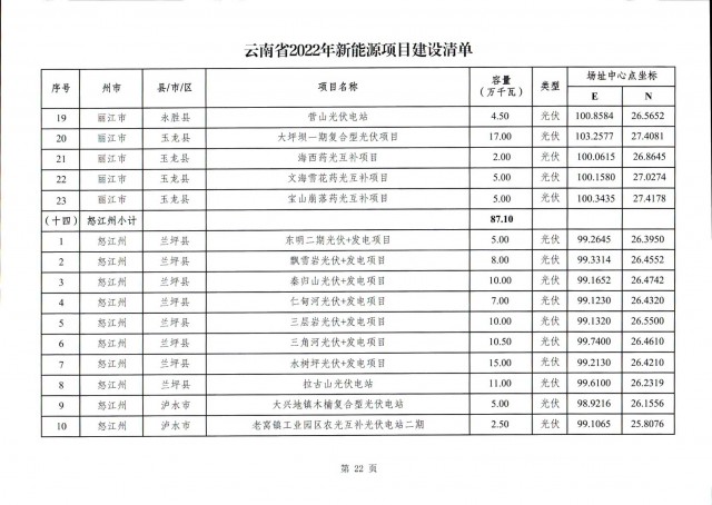 7月22日,云南省能源局正式印發(fā)了《云南省2022年新能源建設(shè)方案通知》。明確了2022年云南全省加快推動開工新能源項(xiàng)目355個,裝機(jī)3200.54萬千瓦,其中光伏項(xiàng)目350個,裝機(jī)3165.04萬千瓦;風(fēng)電項(xiàng)目5個,裝機(jī)35.5萬千瓦;除迪慶州外,全省其他州、市均有布局。確保年度開發(fā)新能源規(guī)模1500萬千瓦以上,力爭達(dá)2000萬千瓦。