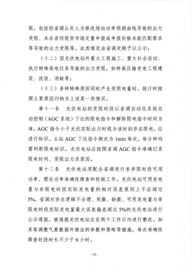 光伏電站可用發(fā)電量與非限電時(shí)段實(shí)際發(fā)電量的相對(duì)誤差原則上不應(yīng)超過(guò)5%。省調(diào)對(duì)存在邏輯不合理、死數(shù)、缺數(shù)、可用發(fā)電量與非限電時(shí)段實(shí)際發(fā)電量最大誤差偏差超過(guò)5%的光伏電站進(jìn)行公示通報(bào)。