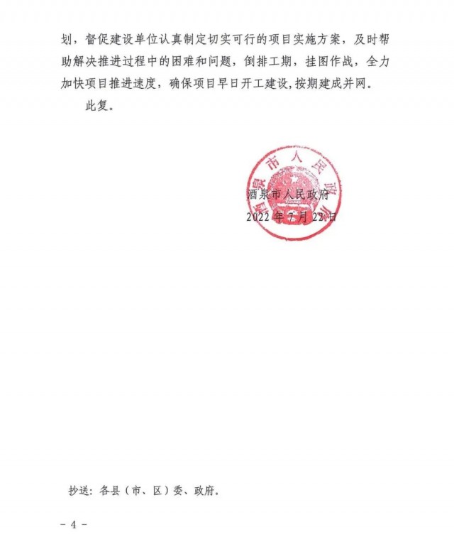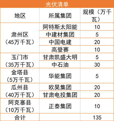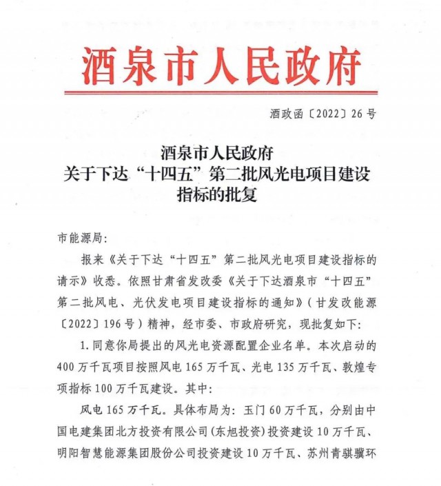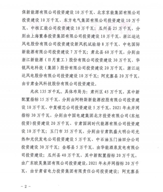 7月22日,甘肅酒泉市人民政府下發(fā)“十四五”第二批風(fēng)光項(xiàng)目建設(shè)指標(biāo)的批復(fù),按照風(fēng)電1.65GW、光伏1.35GW以及敦煌1GW專(zhuān)項(xiàng)指標(biāo)劃分,規(guī)??傆?jì)為4GW,光伏、風(fēng)電總規(guī)模各為2GW。