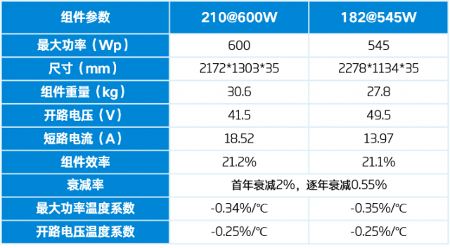 擬采用210硅片組件600W,182硅片組件545W進行行排布對比,各組件參數如下: