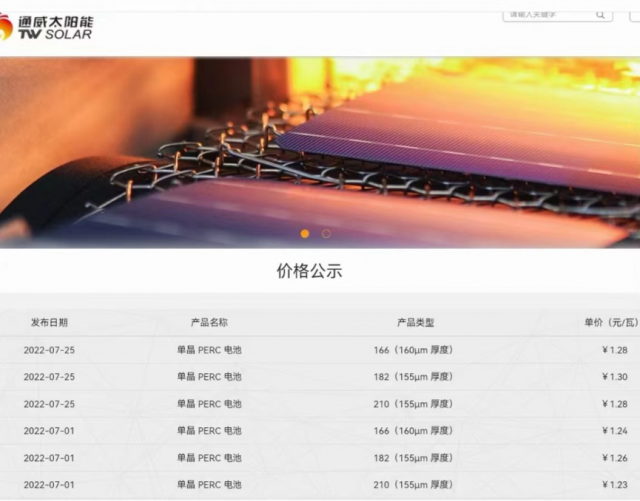 ? 7月25日,通威太陽能官網公布了最新的單晶太陽能電池片定價,不同尺寸的電池片價格上漲4~5分/W;預示著組件價格也會有相應的上漲。
