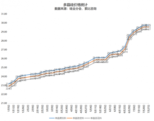 另根據7月27日,中國有色金屬工業(yè)協會硅業(yè)分會公布了太陽能級多晶硅最新價格: