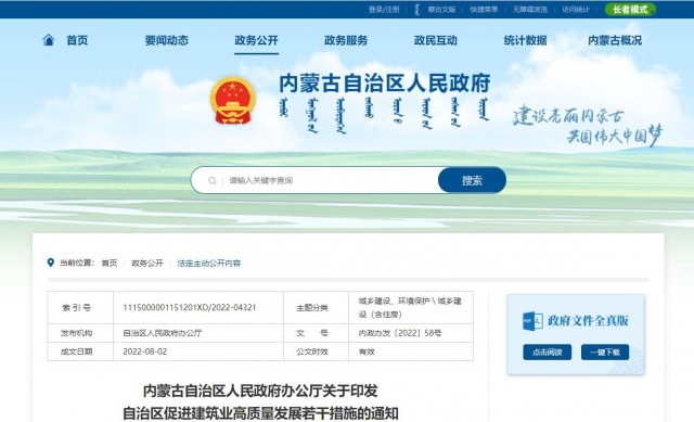 8月5日,內(nèi)蒙古自治區(qū)人民政府辦公廳印發(fā)關(guān)于自治區(qū)促進建筑業(yè)高質(zhì)量發(fā)展若干措施的通知,措施提出大力發(fā)展裝配式建筑、綠色建筑、超低能耗建筑。將裝配式建筑產(chǎn)業(yè)基地(園區(qū))納入自治區(qū)重點示范園區(qū)范圍,享受新型工業(yè)化示范園區(qū)相關(guān)政策。裝配式部品部件生產(chǎn)基地按照工業(yè)用地政策提供用地支持。