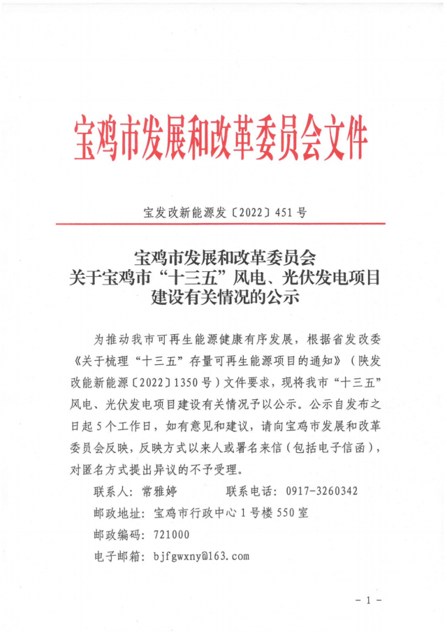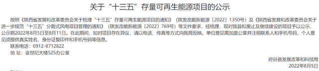 根據(jù)省發(fā)展改革委《關(guān)于梳理“十三五”存量可再生能源項目的通知》(陜發(fā)改能新能源〔2022〕1350號)文件要求,現(xiàn)將我市擬上報省發(fā)改委“十三五”風電、光伏發(fā)電項目建設(shè)有關(guān)情況予以公示。公示自發(fā)布之日起5個工作日,如有意見和建議,請向渭南市發(fā)展和改革委員會反映,反映方式以來人或署名來信(包括電子信函),對匿名方式提出異議的不予受理。