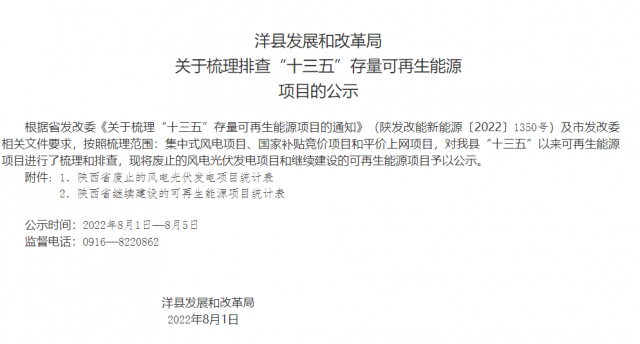 按照省發(fā)展改革委《關(guān)于梳理“十三五”存量可再生能源項目的通知》(陜發(fā)改能新能源〔2022〕1350)有關(guān)要求,我委對全市2019-2020年國家補貼競價項目、省級平價上網(wǎng)項目進行了梳理匯總,西安中旭新能源有限公司40兆瓦光伏電站項目于2020年5月通過備案,截至目前,該項目仍未開工建設(shè)。經(jīng)我委與項目所在地臨潼區(qū)確認,情況屬實,經(jīng)研究,認為該項目為本次梳理可再生能源廢止項目。現(xiàn)將項目情況通過西安市發(fā)改委官方網(wǎng)站(xadrc.xa.gov.cn)進行公示(詳見附表),公示時間自2022年8月12日起至18日止,請社會各界予以監(jiān)督。
